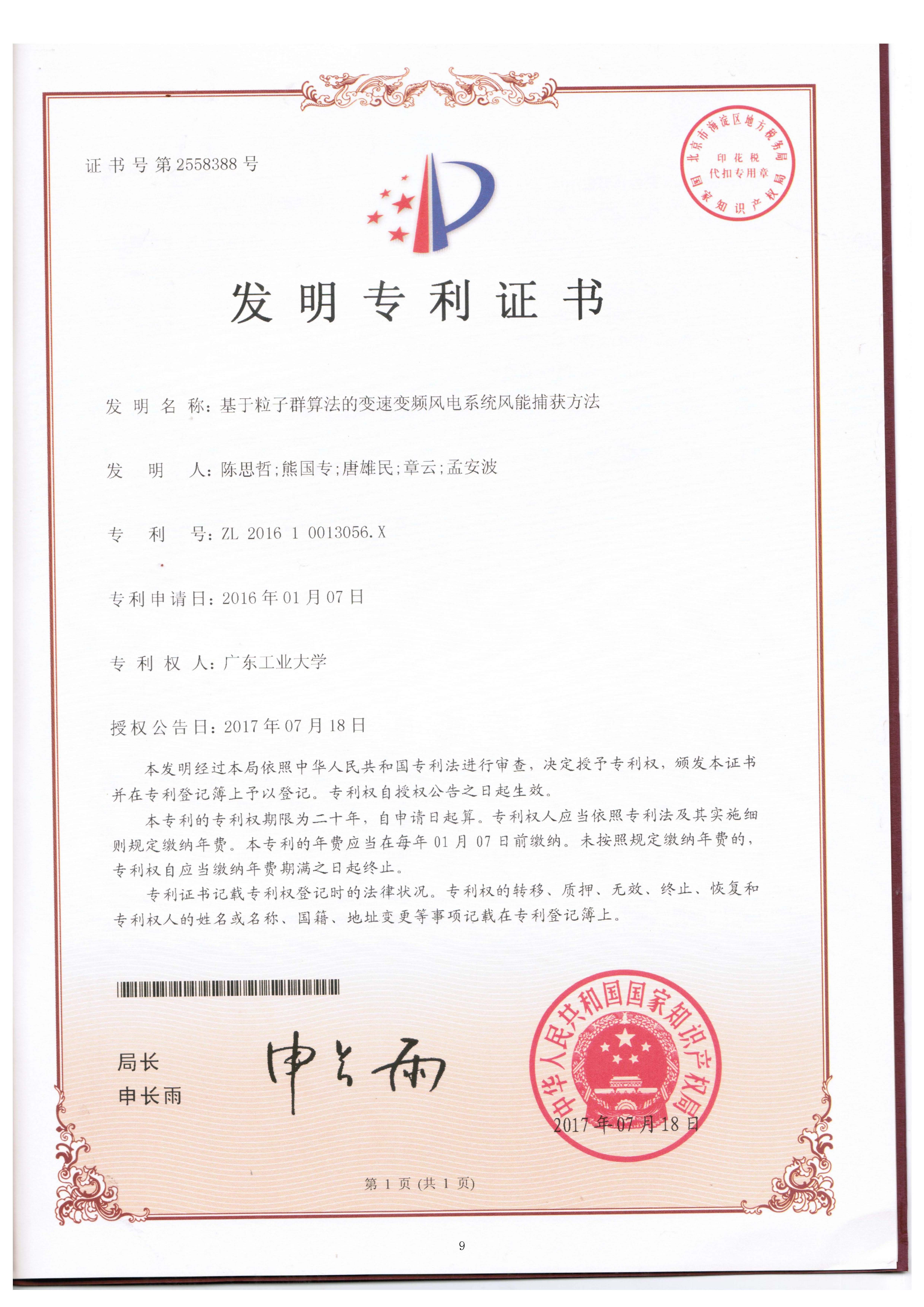 基于粒子群算法的变速变频风电系统风能捕获方法,授权发明专利,ZL201610013056.X