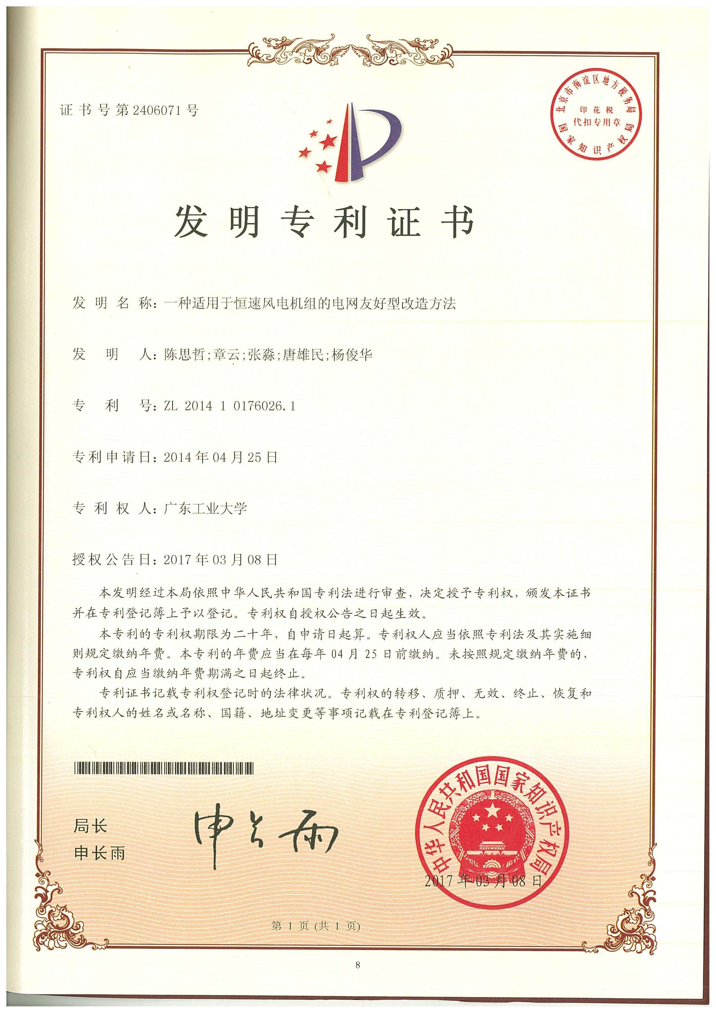 一种适用于恒速风电机组的电网友好型改造方法,授权发明专利,ZL201410176026.1