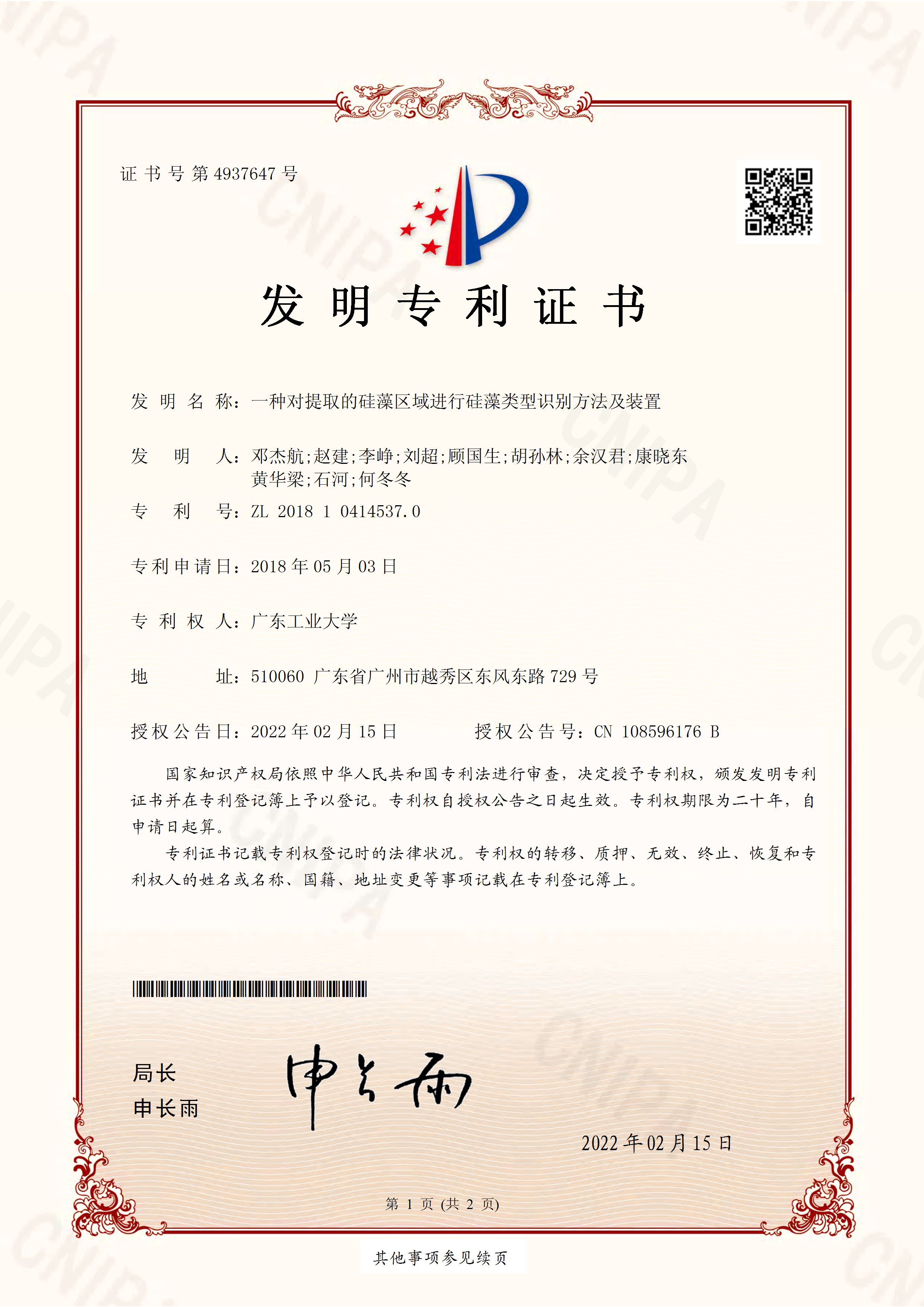 Pre One:MP1714385.20210402.发明专利证书.GDUT2017070603.广东工业大学-邓杰航_页面_1