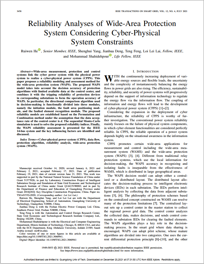第一作者:Ruiwen He, Shenghui Yang, Jianhua Deng, Teng Feng, Loi Lei Lai, and Mohammad Shahidehpour