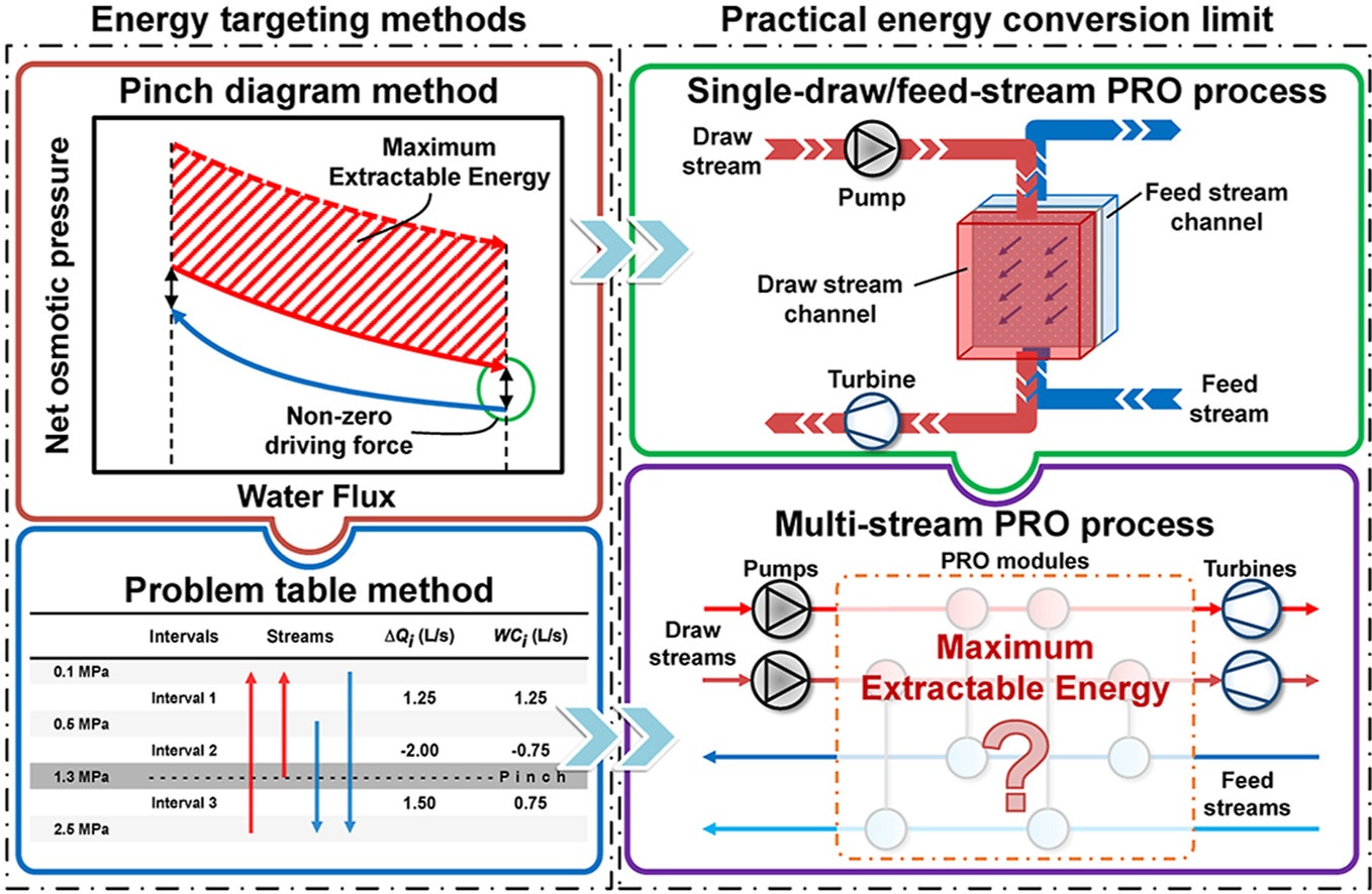 摘要:A thermodynamically oriented method is developed to identify the theoretical and practical limits of pressure-retarded osmosis (PRO) on converting salinity gradient power to mechanical energy under constant operating pressure with infinite and finite mass exchange area, respectively. It is proved that pinch analysis can be used to find the mass exchange limit of PRO, and according to which draw and feed streams can be plotted on a graph of net osmotic pressure - water exchange. Based on the graphical method, an expression of optimal pressure change is derived that achieves the maximum work extraction of a PRO process with single draw/feed stream. Moreover, problem table method is presented that serves as an analytical procedure to determine the maximum extractable work of the conceptualized multi-stream PRO process. Examples of both a PRO process with a draw stream (0.6 M NaCl seawater) and a feed stream feed (0.015 M NaCl river water) and a multi-stream PRO are included to illustrate the proposed methods. Results of the former example show that the counter-current design achieves 30.85% and 31.49% increase, respectively, in the maximum theoretical and practical work output, compared with the co-current design. The latter example shows that the problem table method produces a 20.47% increase in the work output, compared with the standalone design.