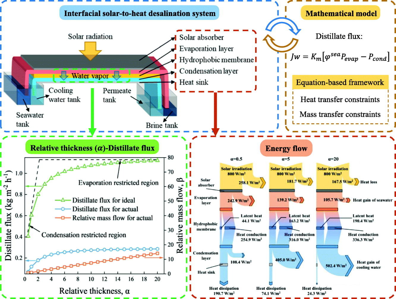 关键字:Passive solar-driven interfacial evaporation (PSDIE) is a highly efficient desalination technology that localizes heating at the evaporation surface, resulting in low heat loss and high evaporation rates. While many studies have focused on improving solar absorber performance, few have systematically analyzed the PSDIE thermodynamics. In this study, we propose a novel PSDIE distiller that effectively avoids salt accumulation. A module-scale model is developed that captures the mass and heat transfer characteristics of the distiller, and comprehensive thermodynamic analysis is performed. Our results show that the relative thickness between the evaporation and condensation layers, namely α, is a critical design parameter that optimizes process performance. An evaporation restricted region (α >5) and a condensation restricted region (α <5) can be identified. We also investigate the influence of hydrophobic membrane properties, finding that their effects depend on α. Our analysis demonstrates that inlet salinity of seawater feed has a detrimental effect on the water productivity of the distiller, while distiller with larger α tends to be more salt tolerable. Finally, we propose a design for a multistage distiller system and evaluate its water production performance, the results show that additional evaporation stages are beneficial to the distiller with smaller α.