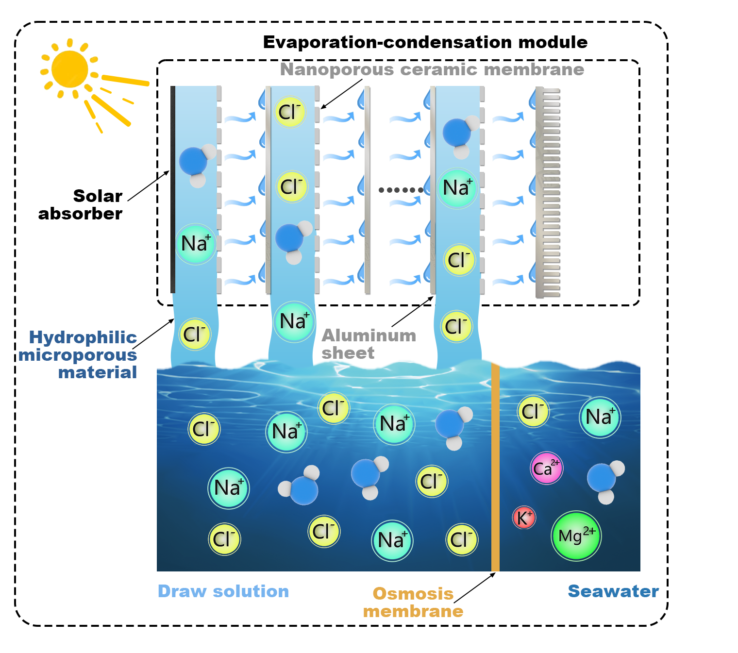 关键字:The growing global water crisis necessitates sustainable desalination solutions. Conventional desalination technologies predominantly confront environmental issues such as high emissions from fossil fuel-driven processes and challenges in managing brine disposal during the operational stages, emphasizing the need for renewable and environmentally friendly alternatives. This study introduces and assesses a bio-inspired, solar-driven osmosis desalination device emulating the natural processes of mangroves with effective contaminant rejection and notable productivity. The bio-inspired solar-driven osmosis (BISO) device, integrating osmosis membranes, microporous absorbent paper, and nanoporous ceramic membranes, was evaluated under different conditions. We conducted experiments in both controlled and outdoor settings, simulating seawater with a 3.5 wt% NaCl solution. With a water yield of 1.51 kg·m-2·h-1 under standard solar conditions (one sun), the BISO system maintained excellent salt removal and accumulation resistance after up to eight hours of experiments and demonstrated great cavitation resistance even at 58.14 °C. The outdoor test recorded a peak rate of 1.22 kg·m-2·h-1 and collected 16.5 mL in eight hours, showing its practical application potential. These results highlight the BISO device’s capability to address water scarcity using a sustainable approach, combining bio-inspired design with solar power, presenting a viable pathway in renewable-driven desalination technology.