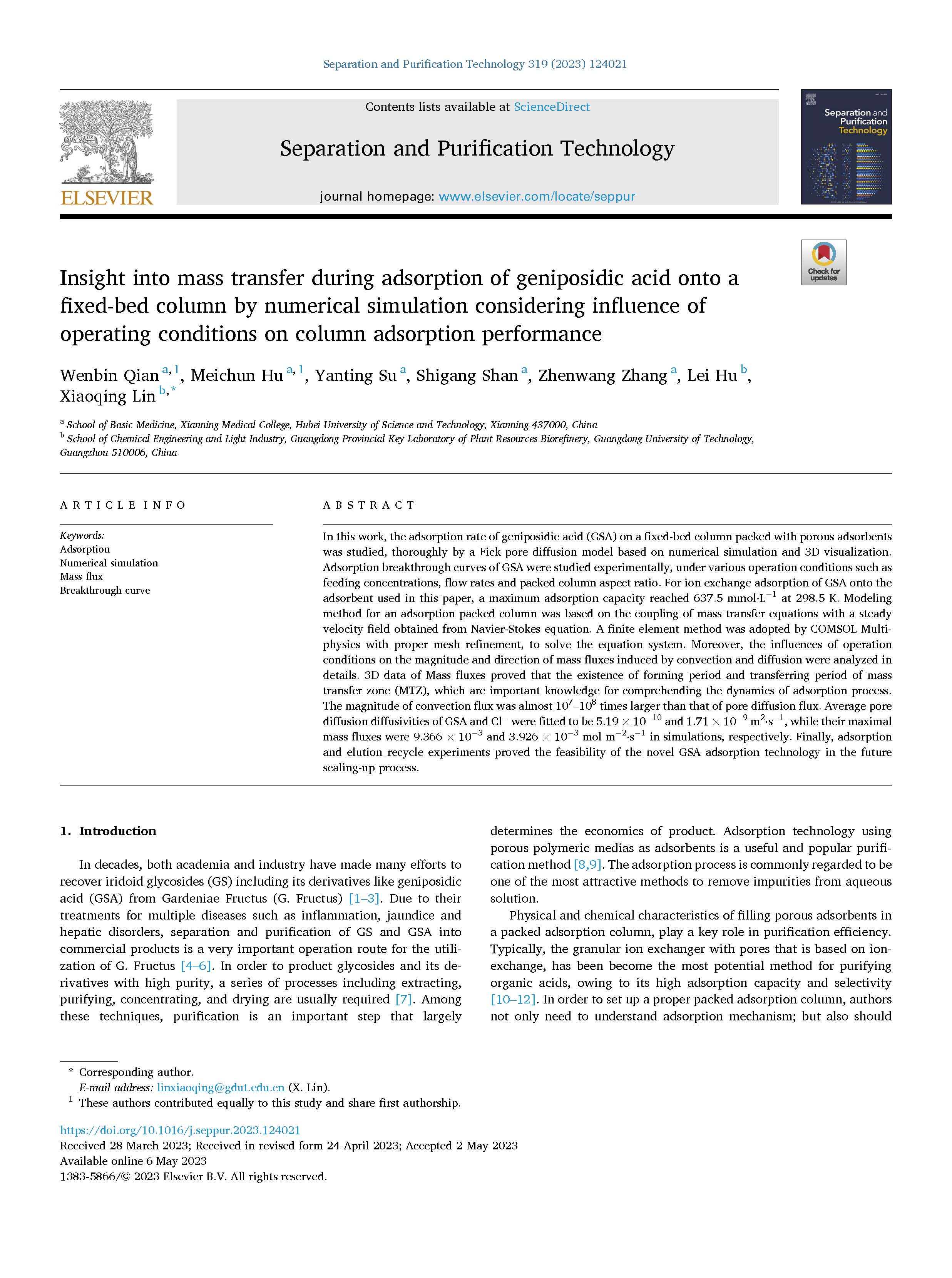 Pre One:Xian X (学生), Zheng X, Huang J, Qureshi N, Li B, Liu J, Zeng Y, Nichols NN, Lin X*. Detoxification of high solid-liquid hydrothermal pretreated sugar cane bagasse by chromatographic adsorption for cellulosic ethanol production, Industrial Crops and Products, Industrial Crops and Products, 2023, 202: 117048. (SCI 1区Top期刊,学校Top期刊) Next One:Mai Y (学生), Xian X, Hu L, Zhang X, Zheng X, Tao S, Lin X*. Liquid-liquid extraction of levulinic acid from aqueous solutions using hydrophobic tri-n-octylamine/alcohol-based deep eutectic solvent, Chinese Journal of Chemical Engineering, 2023, 54: 248-256. (Front Cover, 中国化工学会会刊,SCI 2区期刊)