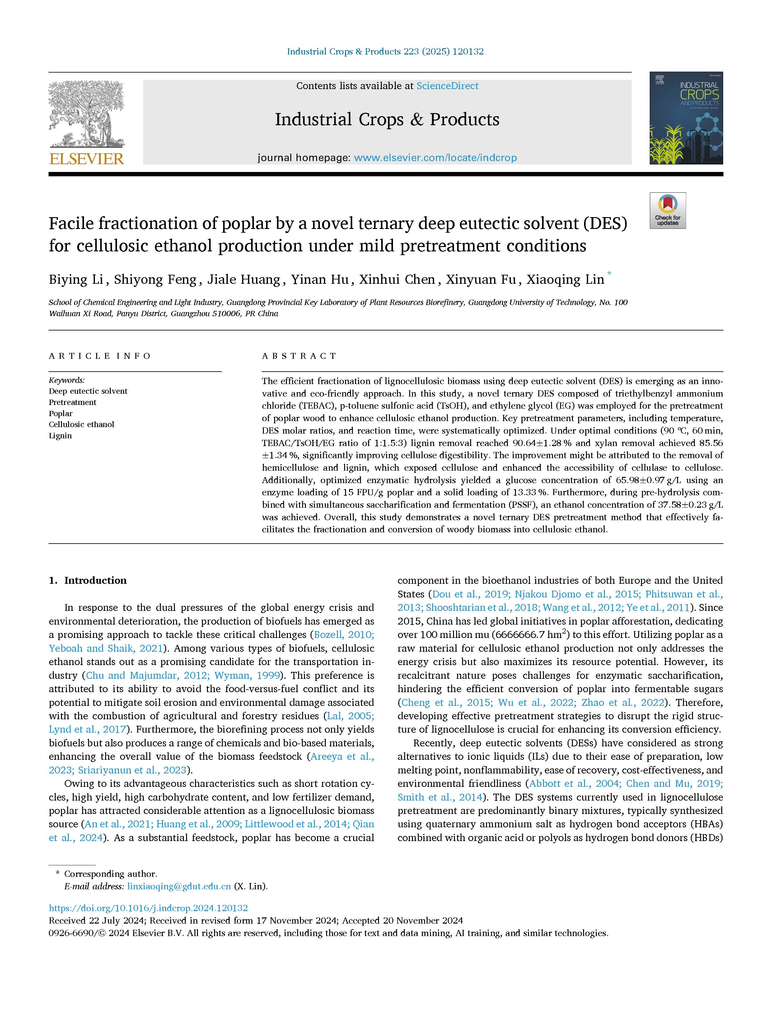 Pre One:Mai Y (学生), Xie K, Liang S, Li G, Song J, Shi C, Song Z, Lin X*. Efficient extraction of 5-hydroxymethylfurfural from multi-components aqueous solution by hydrophobic deep eutectic solvents, Separation and Purification Technology, 2025, 359, 130572. (SCI 1区Top期刊,化工领域高质量科技期刊分级T1) Next One:Fu X (学生), Liu J, Zhang X, Liu Y, Wu T, Lin X*. High-performance removal of methylene blue dye using porous lignin extracted from sugarcane bagasse by deep eutectic solvent, International Journal of Biological Macromolecules, 2024, 279: 135470. (SCI 1区 Top期刊,学校Top期刊)