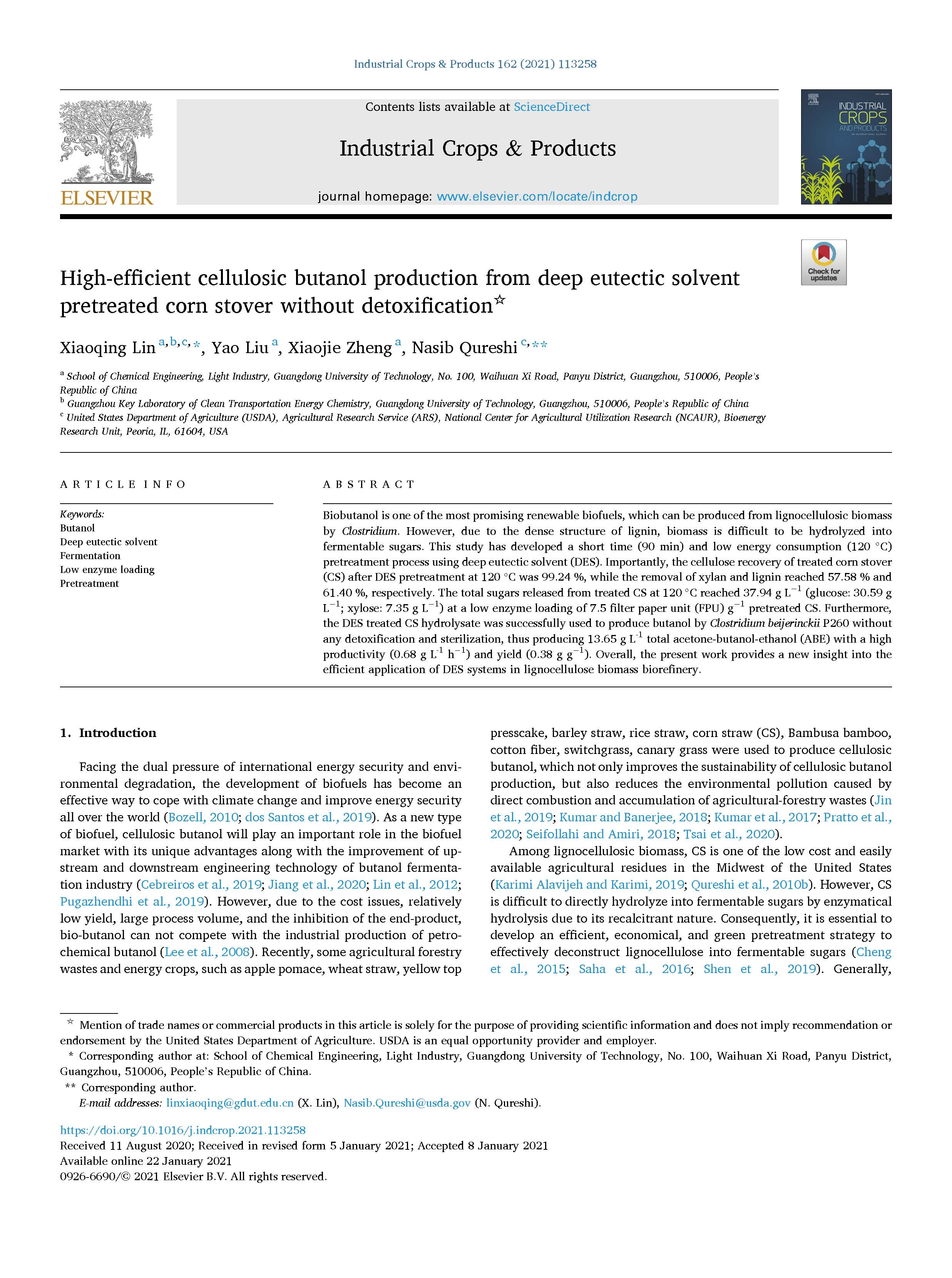 Pre One:Liu Y (学生), Zheng X, Tao S, Hu L, Zhang X, Lin X*, Process optimization for deep eutectic solvent pretreatment and enzymatic hydrolysis of sugar cane bagasse for cellulosic ethanol fermentation, Renewable Energy, 2021, 177: 259-267. (SCI 1区Top期刊, 学校Top期刊) Next One:Hu L (学生), Zheng J, Li Q, Tao S, Zheng X, Zhang X, Liu Y, Lin X*. Adsorption of 5-hydroxymethylfurfural, levulinic acid, formic acid, and glucose using polymeric resins modified with different functional groups. ACS Omega. 2021, 6(26): 16955-16968
