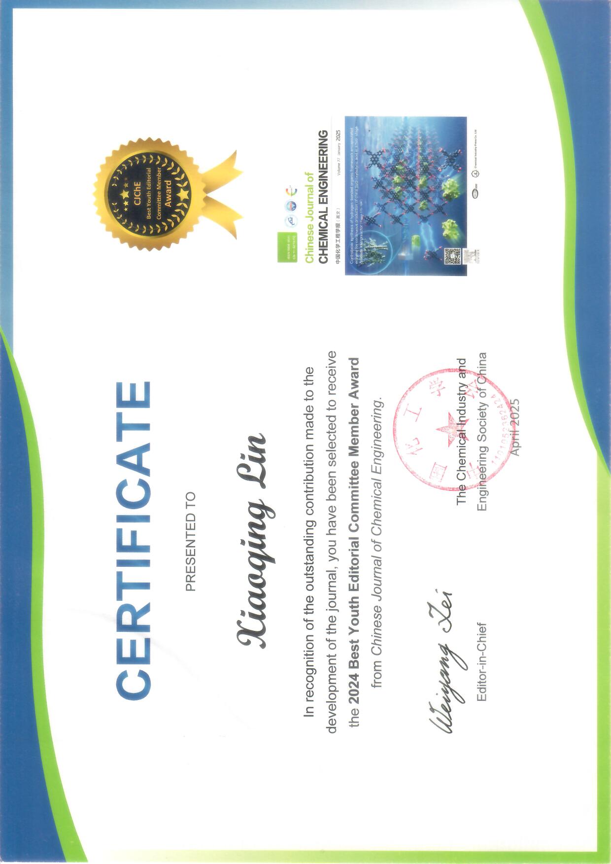 2024 Chinese Joural of Chemical Engineering最佳青年编委奖(Best Youth Editorial Committee Member Award)