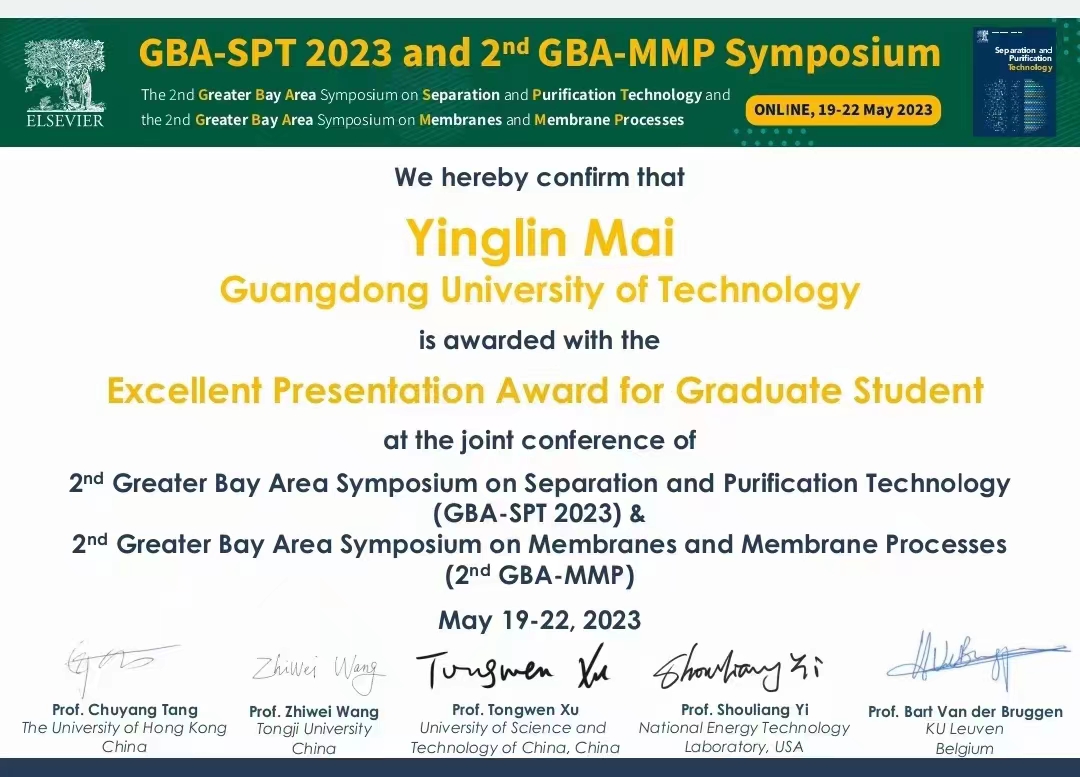 课题组麦颖琳获得GBA-SPT 2023 Excellent Presentation Award for Graduate Student