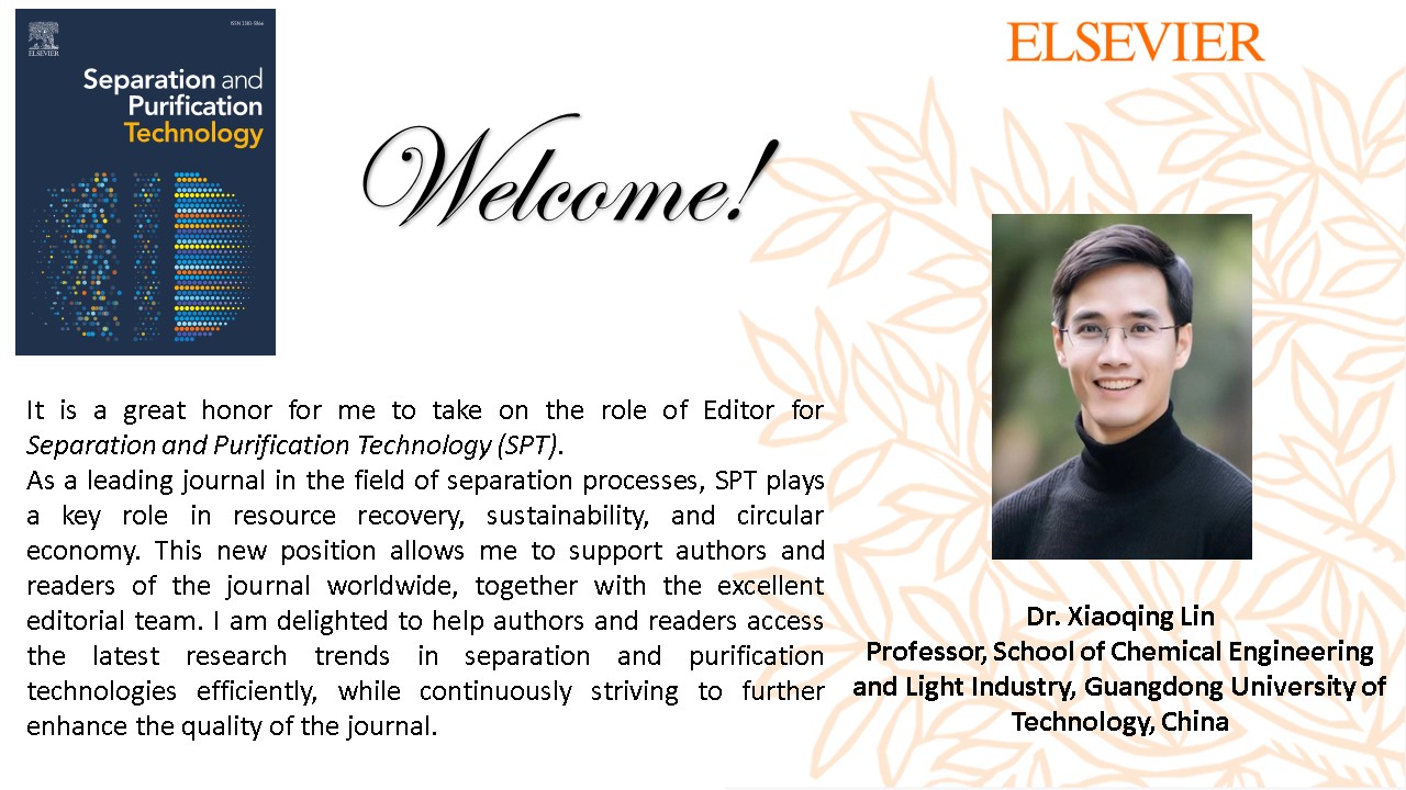 课题组林晓清老师受邀担任分离科学领域国际知名期刊《Separation and Purification Technology》(IF:9.0,JCR 1区,SCI Top期刊,中国化工学会化工领域高质量科技期刊分级T1期刊)副主编(Editor)