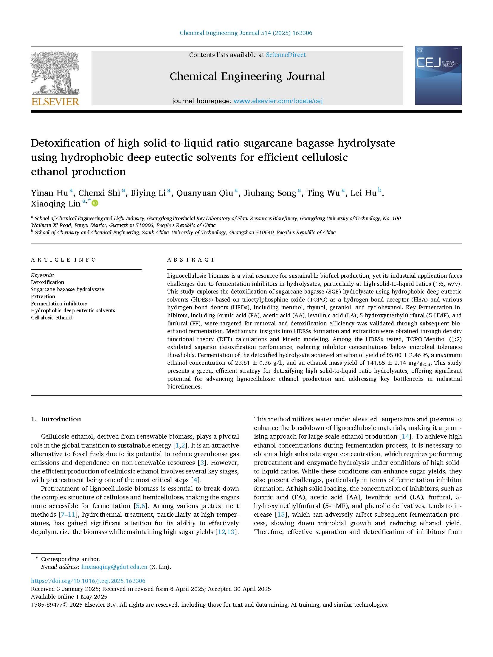 Hu Y (学生), Shi C, Li B, Qiu Q, Song J, Wu T, Hu L, Lin X*. Detoxification of high solid-to-liquid ratio sugarcane bagasse hydrolysate using hydrophobic deep eutectic solvents for efficient cellulosic ethanol production. Chemical Engineering Journal 2025, 514, 163306(SCI 1区Top期刊,化工领域高质量科技期刊分级T1, 学校Top期刊).