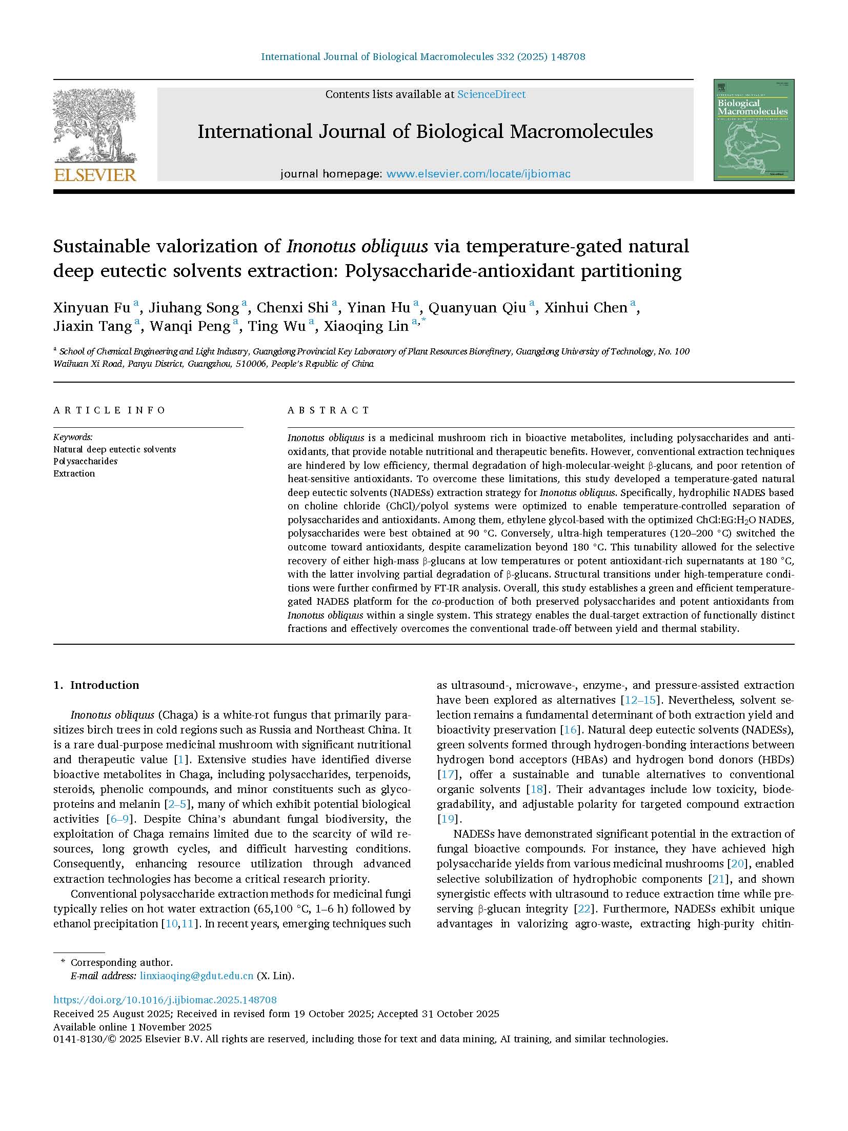 Fu X (学生), Song J, Shi C, Hu Y, Qiu Q, Chen X, Tang J, Peng W, Wu T, Lin X*. Sustainable valorization of Inonotus obliquus via temperature-gated natural deep eutectic solvents extraction: Polysaccharide-antioxidant partitioning, International Journal of Biological Macromolecules, 2025, 332 (2): 148708. (SCI 2区Top期刊,学校Top2期刊)